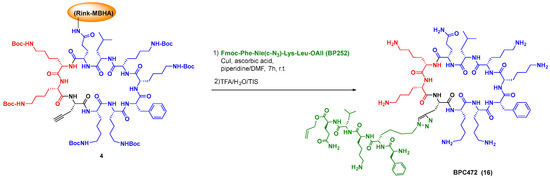 Although this strategy represents a synthetic challenge, due to the similar reactivity of the amino acid units, in the last years a variety of methods have allowed the selective modification of peptides and proteins. In the tag-and-modify approach, a functional group in a residue (tag) is replaced or transformed into other ones. For instance, amino acids with haloaryl units undergo sp2-sp2 couplings [112]. Click chemistry provides a practical method for the introduction of different groups and even the ligation of peptide fragments, as shown by the synthesis by Planas et al. of cyclic peptidotriazoles derived from the antimicrobial peptide BPC194 (Scheme 7, conversion 4→16, [113]). Some of them presented potent activity against plant pathogens, from bacteria to fungi, while producing low hemolysis, and were quite stable towards protease cleavage [106,113,114].