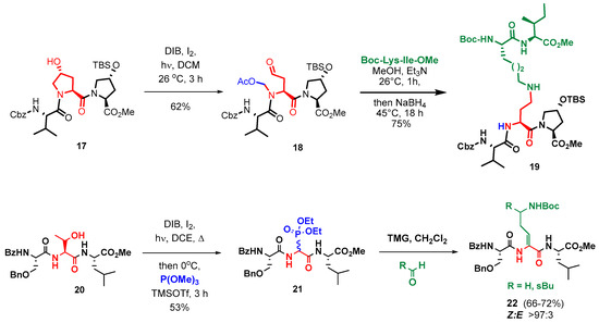 In a second approach for the generation of peptide libraries by site-selective modification, the core of the starting amino acid (customizable unit) undergoes a scission process and is converted into a very different one (e.g., by cleavage of the lateral chain and attachment of a new one). Recently, our group has introduced new customizable units that allow the site-selective modification of peptides and the creation of both cationic or hydrophobic residues [111,115,116,117,118,119]. Peptide ligation is also possible, as shown in the Scheme 8. This strategy has allowed the synthesis of peptide libraries with arylglycine, 4-aminohomoalanines, dehydroamino acid units, β- and γ-amino acid residues, and many other residues. Some of these compounds have displayed a promising activity against plant and animal pathogens.