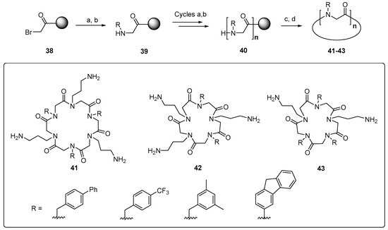 Other useful peptidomimetics are peptoids, glycine oligomers where the “lateral chains” are attached to the amide nitrogen. The amphiphilic cyclic peptoids 41–43 shown in Scheme 9 present cationic chains, resembling the ornithine units, and hydrophobic chains containing aromatic groups.