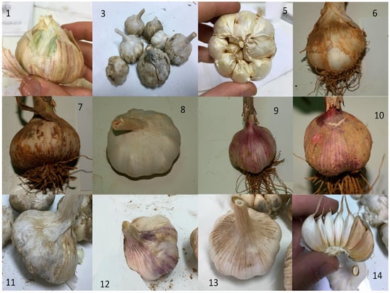 Pictures of selected genotypes and local landraces of the studied garlics. Numbers on each picture correspond to specific genotypes as described in the Materials and Methods section (Pictures with numbers 1, 3, 5, 8, 11, 12, 13, 14 have been offered by Mr. Nikolaos Polyzos).