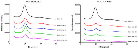 Figure 3 presents the X-ray powder diffractograms for the polymeric salts derived from PAM-18. Broad dispersion patterns are observed, which is typical of amorphous and atactic polymeric materials [24,25,26]. Additionally, the results show that the hydrolysis/ionization process does not significantly affect the polymeric amorphousness in the materials. Moreover, the X-ray diffraction behavior was very similar in both polymeric families, and the Na+ and K+ counter ions did not seem to make a significant difference.