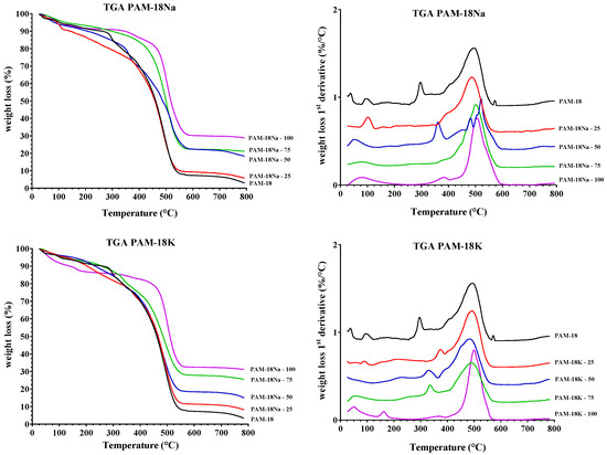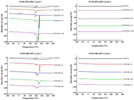 In the case of the PAM-18Na-25 and PAM-18K-25 materials (red curves), the same glass transition event was observed along with another endothermic event given between 150 °C and 170 °C (first heating cycle), which disappeared with the second heating cycle. This result indicates that such materials present bound water probably obtained in the hydrolysis/ionization processes. On the other hand, the rest of the polymeric materials showed the same glass transition event given in the precursor material. Likewise, endothermic events related to the loss of bound water in the same temperature range and signal disappearance in the second heating cycle were also observed [27]. Finally, it is worth noting that PAM-18Na materials presented a higher intensity in the endothermic curve than the PAM-18K materials. This result suggests that PAM-18Na materials tend to bind water more strongly than PAM-18K materials.