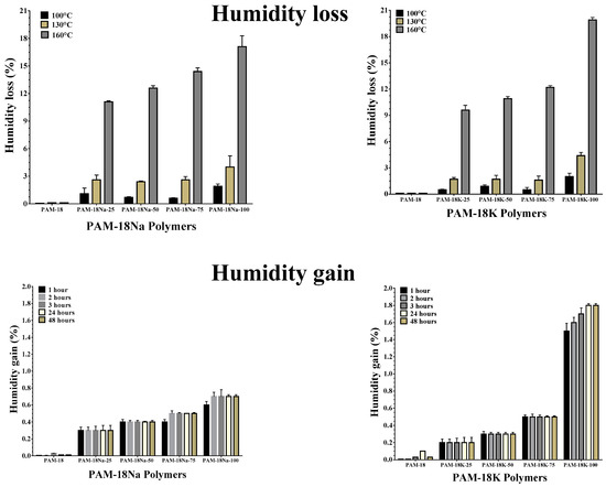 The capability of the loss and gain of humidity by the PAM-18Na and PAM-18K polymers are shown in Figure 7. The results of the humidity loss show a strong relationship with the results obtained by DSC and TGA, where the increment in the applied temperature led to higher humidity loss in the polymeric materials. This result suggests that different polymeric materials bind water differently. In the case of humidity loss at 100 °C, the results showed that, for the PAM18 precursor polymer, no significant humidity loss was observed, which is consistent due to the hydrophobic nature of the polymer. In the case of the modified materials, a humidity loss lower than 3% was observed for the materials with higher ionization degrees (PAM-18Na-100 and PAM-18Na-100) and less than 1% for the rest of the polymeric materials. These humidity losses could be attributed to the moisture adsorbed on the polymeric powder surface.