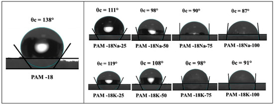 In order to know more about effect of the interactions in the humidity gain phenomena, we measured the contact angle (θc) formed between each material and ultra-pure water. The results are shown in Figure 8. These results are very interesting, since they showed that the hydrophobicity is inversely proportional to the ionization degree. Likewise, it was observed that θc values of PAM-18Na were slightly smaller than those of the PAM-18K polymers. In the case of the PAM-18 precursor polymer, a θc value of 138° was observed, suggesting that the polymeric surface is strongly hydrophobic, and this effect is probably given by the specific orientation of the polymer alkyl chains, which are probably pointing normal to the surface. These results are strongly related to those observed in the powder fluidity and humidity gain studies. In the case of PAM-18Na-25 and PAM-18K-25, the θc values were 111° and 119°, respectively, having a very similar behavior to the precursor polymer. In the cases of PAM-18Na-50 and PAM-18K-50, the θc values were 98° and 108°, respectively. On the other hand, for the PAM-18Na-100, PAM-18K-100, PAM-18Na-75, and PAM-18K-75 materials, the θc values were 87°, 91°, 90° and 98°, respectively. These values are close to the “limit zone”, where the wettability phenomenon begins to occur (<90°). These results are consistent if they are related to those previously described, as (i) formation of polymer solutions, (ii) higher ionization performance, (iii) longer lyophilization time, (iv) higher capacity to imbibe water in the form of hydrated polymers, and (v) lower capacity to flow.