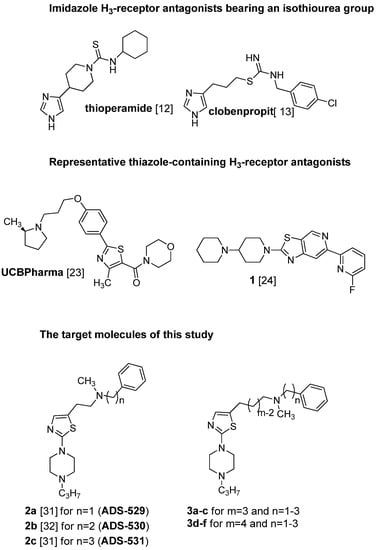Many ligands of this type have found utility in experimental studies as pharmacological tools []. However, the presence of an imidazole ring with strong hydrogen bond acceptor and donor properties causes low bioavailability and greatly limits penetration of the blood-brain barrier [,]. Among others, these compounds bind to the heme iron in CYP enzymes [], and when co-administrated with other interacting drugs, can lead to adverse side-effects through drug-drug interactions []. Following these discoveries, and the successful cloning of the H3 receptor by Lovenberg et al. [] in 1999, the intensive search for non-imidazole-based compounds was resumed, as these compounds may offer improvements in binding affinity and CNS penetration [,]. Despite significant differences in molecular weight and polarity, a general pharmacophore model has been developed for non-imidazole H3-antagonists. They are usually characterized by a basic group, often a tertiary amine, connected through an aliphatic spacer to a second pharmacophoric fragment which includes, a lipophilic substituent (often with a phenyl-like structure), depending on the series; some pronounced examples where the phenyl moiety was successfully replaced by different heterocyclic rings, one being a structurally modified thiazole ring are given in the literature [,]; (UCBPharma and compound 1, Figure 1). The lipophilic part is accompanied by another displaying high chemical diversity, such as an H-donor/acceptor, a 2nd basic part or acid group or lipophilic residue []. These efforts have resulted in a number of non-imidazole antagonists with high selectivity and specificity. The successful replacement of the imidazole moiety with pyrrolidine, piperidine, piperazine and other basic tertiary amines has been reported in patent applications and chemistry papers [,,,]. Recently, compound BF2.649 (Wakix®), an H3 inverse agonist, carrying the characteristic 3-aminopropan-1-ol functionality in its structure, has undergone clinical studies, and been approved and registered as a drug against narcolepsy []. Our previous study described two series of N-methyl-2-[2-(4-propylpiperazin-1-yl)-1,3-thiazol-5-yl]- [] and N-methyl-2-[2-(4-propylpiperazin-1-yl)-1,3-thiazol-4-yl]ethan-1-amine derivatives [] in which the terminal secondary N-methylamino function has been substituted with ω-aliphatic and ω-phenylaliphatic moieties (carbon chains of varying lengths from one to five methylene groups) with moderate to pronounced affinity for the histamine H3 receptor. It was shown by comparison of the homologous pairs of both series, that the presence of the aforementioned substituents at position 5 in the thiazole ring is favorable for histamine H3 receptor antagonist activity, whereas substitution at position 4 typically leads to a strong decrease of activity. The highest affinity for these series was seen for the derivative bearing N-methyl-N-phenylpropyl moiety [], (compound ADS-531; pA2 = 8.27; Figure 1) and slightly lower affinity for the one carrying an N-methyl-N-benzyl or N-methyl-N-phenylethyl substituent [] (2a, pA2 = 7.76; 2b, pA2 = 7.61). The most active compound ADS-531, which did not exhibit any H1-antagonistic activity, was chosen as the lead compound for further structural modification.