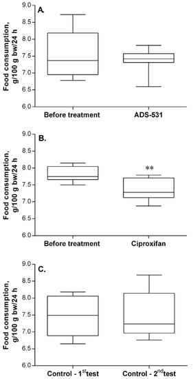 The effect of ADS-531 (s.c. 3 mg/kg/daily for five days), the newly synthesized histamine H3 receptor antagonist (chart A), and of the reference ciproxifan (s.c. 3 mg/kg/daily for five days; chart B) on food consumption. Consumption by untreated rats (chart C). Median (the line in the middle of the box) and the range of values (whiskers) are given for eight rats. Paired t-test, ** p < 0.01 vs. before treatment.