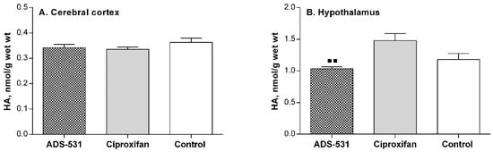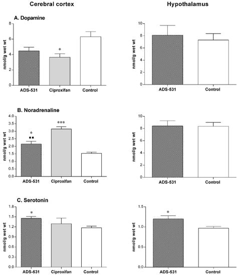 One way ANOVA and Tukey’s multiple comparisons test showed no statistically significant differences. The apparent lack of the effects of the tested compound on the histaminergic system was by no means caused by the lack of its ability to cross the blood-brain barrier. The data presented in Figure 4 clearly indicates that ADS-531 caused alterations in the concentrations of dopamine, noradrenaline, and serotonin.