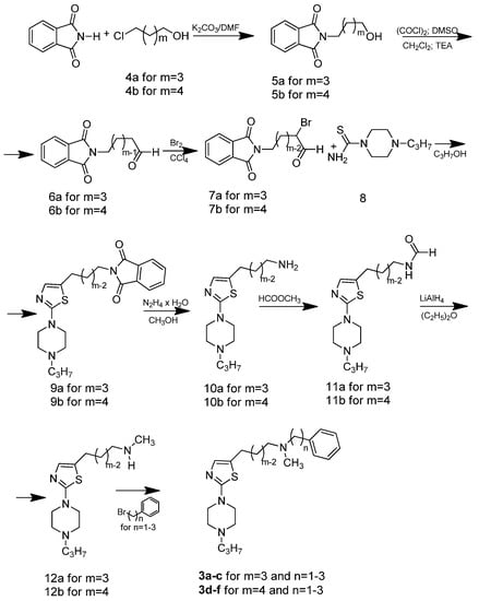 The general synthetic procedure used in this study is illustrated in Scheme 1. The central building blocks of the title compounds (compounds 3a–c and 3d–f) were 3-[2-(4-propylpiperazin-1-yl)-1,3-thiazol-5-yl]propan-1-amine (10a) and 4-[2-(4-propylpiperazin-1-yl)-1,3-thiazol-5-yl]butan-1-amine (10b), respectively (Scheme 1). The phthalimidobutanols 5a and 5b were prepared from ω-chloroalkanols 4a and 4b and phthalimide to yield 70% and 62% of the desired compounds, respectively.