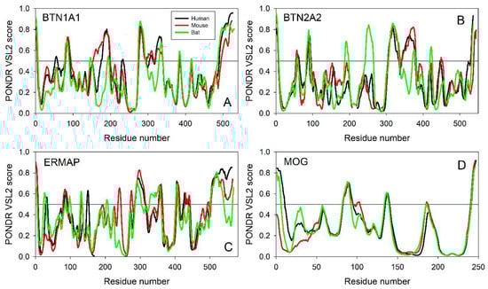 Figure 3. Evolutionary conservation of the peculiarities of intrinsic disorder predisposition in butyrophilins as evaluated by PONDR® VSL2. (A) BTN1A1. (B) BTN2A2. (C) ERMAP. (D) MOG. Results for proteins from human, mouse, and Tasmanian devil are shown by black, red, and green lines, respectively. A disorder threshold is indicated as a thin line (at score = 0.5) in all plots to show a boundary between disorder (>0.5) and order (<0.5).
