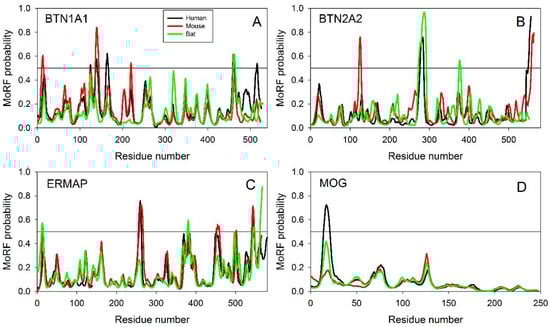 Note that to be considered as a MoRF, a region of a query protein should be longer than six residues and show MoRF probability exceeding 0.5 for its entire length [52,53]. Although analyzed proteins contain only a few regions satisfying these criteria, Figure 4 clearly shows that the individual members of the BTN family are characterized by an astounding similarity of their MoRF profiles; i.e., distributions of the MoRF probabilities in their sequences. These observations suggest that positions of not only MoRFs, but also regions with some inclination to be potential disorder-based binding sites are generally conserved over a long time (at least since the time of marsupial divergence 160 million years ago (http://www.timetree.org/) [29]).
