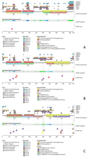 Figure 5. Evaluation of the functional intrinsic disorder propensity of human butyrophilins. Analysis of BT1NA1 (A), BT1NA2 (B), and BTN1A3 (C) was conducted by D2P2 (http://d2p2.pro/) [59]. In each plot, nine colored bars represent location of disordered regions found by different disorder predictors. A set of differently colored bars shows the location of the functional domains found by the Pfam platform, which is a database of protein families that includes their annotations and multiple sequence alignments generated using hidden Markov models [64,65,66]. Green-blue-and-white bars in the middle of the plots show the predicted disorder agreement between these nine predictors, with green and blue parts corresponding to disordered regions by consensus. Differently colored circles at the bottom of the plots show the locations of various PTMs.