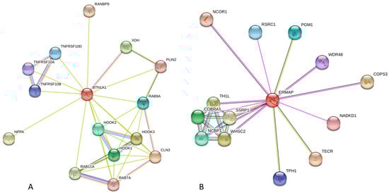 Figure 6. Evaluation of the interactivity of some human butyrophilins. Human BT1NA1 (A) and ERMAP (B) were analyzed by STRING platform (http://string-db.org/cgi/) [63]. An edge, which represents protein-protein interaction, may be drawn with up to 7 differently colored lines that reflect the existence of seven types of evidence used in predicting the associations. A red line indicates the presence of fusion evidence; a green line–neighborhood evidence; a blue line–co-occurrence evidence; a purple line–experimental evidence; a yellow line–text mining evidence; a light blue line–database evidence; a black line–co-expression evidence.