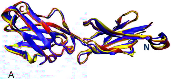 Figure 7. (A) Multiple structural alignments of the crystal structures of ectodomains of human BTN3A1 (residues 30–246, PDB ID: 4F80; yellow structure), BTN3A2 (residues 30–239, PDB ID: 4F8Q; blue structure), and BTN3A3 (residues 30–246, PDB ID: 4F8T; red structure). Structures were aligned using the MultiProt tool [118]. (B) Crystal structure of the intracellular B30.2/SPRY domain of human BTN3A1 (residues 272–513, PDB ID: 5HM7).