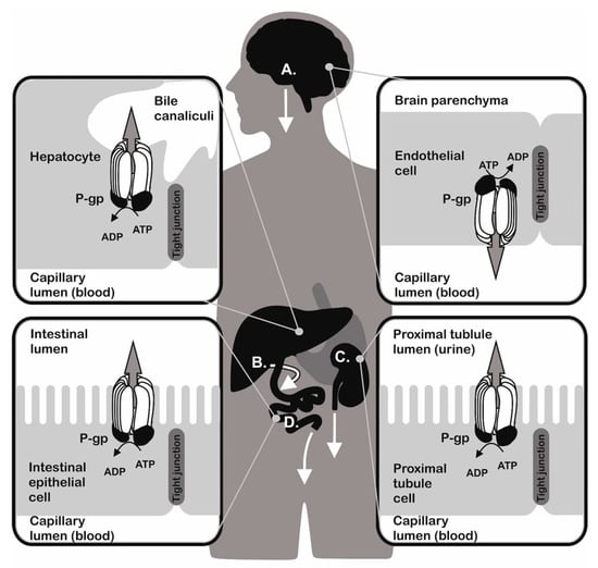 Biological function of P-glycoprotein (P-gp) in various tissues. (A) The blood-brain barrier separates blood circulating in the brain capillaries from the brain tissue. P-gp is one of the blood-brain barrier components and is localized on the luminal side of brain micro-capillary endothelial cells, where it prevents the penetration of xenobiotics through the endothelium to brain tissue; (B) P-gp promotes the excretion function of liver by transporting substances with limited solubility in water and their metabolites formed by enzymes of the first and second phase of liver detoxification machinery from hepatocytes into the bile; (C) P-gp in the proximal tubule cells of the nephrons secures elimination of water soluble substances via urine; (D) The gut blood barrier prevents the absorption of pathogens and toxins from diet [21,22]. P-gp is localized in the mucosal cells of the small intestine and promotes the integrity of the gut blood barrier by pumping harmful substances into the lumen of the intestines.