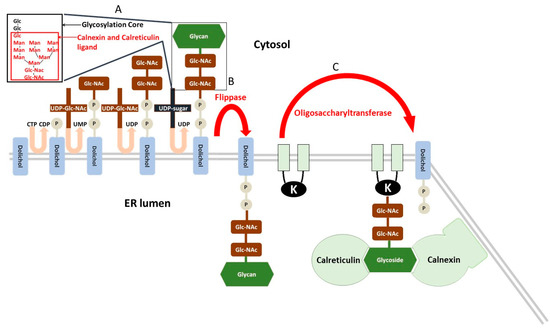 N-glycosylation of protein in the endoplasmic reticulum (ER). (A) Synthesis of glycosylation core (Glc3Man9NAcGlc2) on dolichol attached to the ER membrane and oriented to the cytosol; (B) Relocation of the newly synthetized glycosylation core from the cytosolic to the luminal side of the ER by distributing flippase [58]; (C) Transfer of glycosylation core from dolichol phosphate to protein by oligosaccharyltransferase (EC 2.4.1.119) [62] and specific linkage of new glycoprotein with Ca2+-dependent lectins/chaperones of ER calnexin and calreticulin [63,64] due to its affinity for the oligosaccharide moiety labelled by a red square in A.