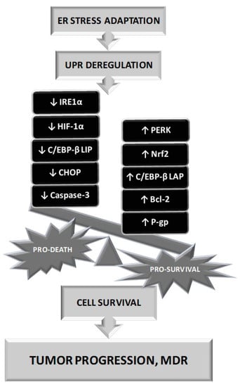 The C/EBP family of proteins is a group of transcription factors involved in regulation of cellular responses to ERS [146]. Riganti et al. investigated the role of C/EBP-β and CHOP members in establishing MDR. Transcription factor C/EBP-β can have a pro apoptotic effect, which is mediated by the natural dominant negative, truncated transcriptional repressor liver-enriched inhibitory protein LIP isoform. On the other hand, the liver-enriched transcriptional activator protein LAP isoform also promotes tumour progression by attenuating ERS-triggered cell death [147]. They determined that MDR cells do not express LIP, which undergoes ubiquitin-mediated degradation and failed to activate the pro apoptotic CHOP/caspase-3 pathway upon ERS or chemotherapy induction. They proposed that the lack of LIP results in two independent actions, particularly in upregulation of P-gp and attenuation of ERS triggered apoptosis [140].