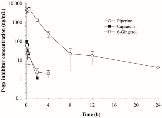 Plasma concentration vs. time profiles of piperine, capsaicin and [6]-gingerol after intraperitoneal injection in mice (n = 6, mean ± SD).