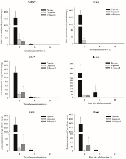 Consistent with their plasma concentration vs. time profiles, capsaicin and [6]-gingerol were not detected in the most tissues except in liver at 8 h after administration, whereas piperine was distributed into various tissues 8 h after administration (Figure 2). In most tissues, the concentration of piperine was much higher than that of capsaicin and [6]-gingerol. None of the phytochemicals was detected in the tissues 24 h after administration. Piperine concentrations were found to be the highest in the kidney, with a tissue to plasma partition coefficient, Kp, kidney = 1.69 ± 0.28, at 2 h after administration, followed by the testis, heart, lung, brain and liver. Capsaicin was distributed most extensively in the liver, followed by the testis, kidney, lung, brain and heart at 2 h after administration (Figure 2). The tissue distribution of [6]-gingerol was most pronounced in the liver, followed by the kidney and lung but was not detected in the brain, heart and testis 2 h after administration (Figure 2).