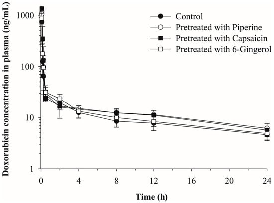 Plasma concentration vs. time profiles of doxorubicin after intravenous injection of doxorubicin at 1 mg/kg in mice pretreated with vehicle (control), piperine, capsaicin, or [6]-gingerol (n = 6, mean ± SD).