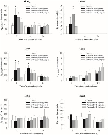 Tissue to plasma partition coefficients (Kp) of doxorubicin 2, 8 and 24 h after intravenous injection of doxorubicin at 1 mg/kg in mice pretreated with vehicle (control), piperine, capsaicin, or [6]-gingerol (n = 6, mean ± SD). * p < 0.05 vs. control.