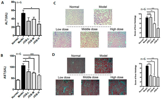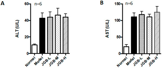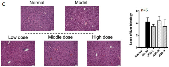 Ethanol (99.9%) and carbon tetrachloride (CCl4, 99.9%) were purchased from Thermo Scientific (Waltham, MA, USA). Liquid ethanol diet and control liquid dextrose diet were bought from Bio-Serv (Flemington, NJ, USA). Choline-deficiency amino acid-defined diet (CDAA) was obtained from Research Diets (New Brunswick, NJ, USA). Kits for alanine transaminase (ALT, catalogue #2930), aspartate transaminase (AST, catalogue #2920) were bought from Medex Supply (Passaic, NJ, USA). Kits for malondialdehyde (MDA, catalogue #A003-1), superoxide dismutase (SOD, catalogue #A001-1), glutathione peroxidase (GSH-Px, catalogue #A005), and catalase (CAT, catalogue #A007-1) were bought from Nanjing Jiancheng (Nanjing, China). Direct red 80, picric acid and oil-red O were purchased from Sigma-Aldrich (St. Louis, MO, USA). The JGB aqueous extract was obtained from Vitagreen (Hong Kong, China), which was produced by mixing the three herbs together and extracting by indicated solvents with standard operation in good manufacturing practice (GMP) manufacturers.
