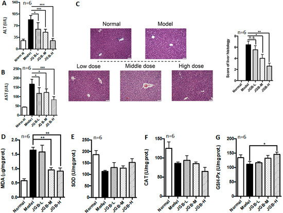 After successfully establishing the chronic plus binge ALD model, the therapeutic potential of JGB on chronic ALD was studied. We observed that JGB consistently relieves chronic plus binge ALD, with reduced ALT and AST activities as well as lower histological scores in treated mice (Figure 3A–C). The microsteatosis and inflammatory cells’ infiltration was significantly relieved by JGB treatment (Figure 3C). Additionally, JGB could reduce MDA level in the liver (Figure 3D). Similar to the observation in the acute model, we found that JGB had no potent effect on the activities of SOD and CAT (Figure 3E–F). However, the activity of GSH-Px was significantly increased by high-dose treatment of JGB (Figure 3G). Overall, similar to the observation in the acute model, JGB had no potent effect on the internal anti-oxidative system of the liver.