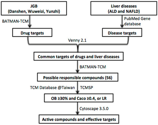 The constituent compounds and related targeted genes of these three herbs (Danshen, Wuweizi, Yunzhi) were identified by BATMAN-TCM (Bioinformatics analysis tool for molecular mechanism of traditional Chinese medicine, http://bionet.ncpsb.org/batman-tcm/). Liver disease targets including ALD and NAFLD were collected from PubMed Database (https://www.ncbi.nlm.nih.gov/pubmed/). The common targets were recognized by VENNY 2.1 (http://bioinfogp.cnb.csic.es/tools/venny/). Then, the network of compounds-targets was constructed by Cytoscape 3.5.0. The pharmaceutical properties’ analysis was performed according to Lipinski’s rule (LR) and the absorption, distribution, metabolism, and excretion (ADME) system.
