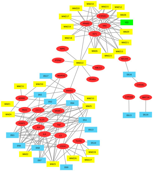 Compound-target network of JGB that is associated with ALD and NAFLD. The red ellipses represent liver disease target genes (26); the blue rectangles (14) are candidate compounds from Danshen; the yellow rectangles (25) are candidate compounds from Wuweizi; the green rectangle (1) is the candidate compound from Yunzhi; the grey lines represent the compound-target interaction. This network comprises 66 nodes (26 target genes and 40 candidate compounds). The compound codes are defined in Table 1.