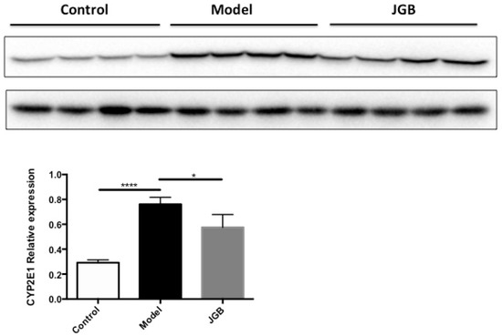 The hepatic protein level of CYP2E1 induced by ethanol was significantly decreased by JGB treatment. * p < 0.05, **** p < 0.0001 when compared with model group.
