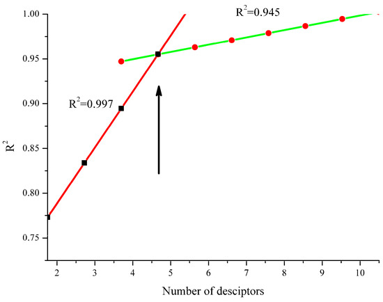 There were six groups of descriptors that reflected all of the features of the compounds, such as molecular composition, connectivity, 3D-coordinates, charge distribution, and quantum chemical data. Through calculation and selection, several significant molecular descriptors were determined during the model development process. The most important descriptors in this work were the quantum-chemical descriptors. In an attempt to establish a relationship between activity and molecular descriptors through several regression approaches, the heuristic regression was chosen to obtain a QSAR model with satisfactory values of R2, F, and S2. Through the “breaking point” rule and the number of molecular descriptors being no more than one-third of the sample number plus one, the descriptor number was determined. The “breaking point” rule results are shown in Figure 1. Finally, the four-descriptor QSAR model was determined as the best model and is shown in Table 2. The four significant descriptors and their values are listed in the Supplementary Materials (Table S2).