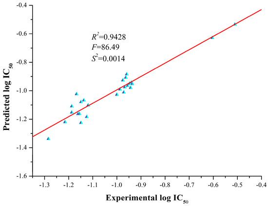 The final four-descriptor QSAR model contained the sample number N = 26, and had the following statistical characteristics: R2 = 0.9428, F = 86.49, S2 = 0.0014. The experimental and predicted log IC50 values are shown in Table 3, which were also compared in Figure 2. The following equation (Equation (1)) describes the four-descriptor QSAR model. In the model, a positive sign (+) indicates that the descriptor value had a positive correlation with log IC50, and that the log IC50 value was higher as the descriptor value was larger. In contrast, a negative sign (−) indicates a negative correlation.