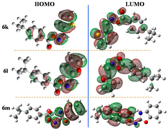 The HOMO and LUMO energy maps for compounds 6k, 6l and 6m.