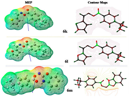The molecular electrostatic potential and contour maps of compounds 6k, 6l and 6m.