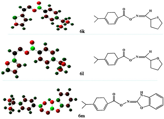 The last important descriptor in the model is the max net atomic charge for an O atom. This electrostatic descriptor reflects the characteristics of the charge distribution of the molecule and is related to the strength of the intermolecular bonding interactions and characterizes the stability of the molecules, their conformational flexibility, and the other valency-related properties [24,25]. Figure 5 shows the optimized geometries and charge distribution of compounds 6k, 6l and 6m.