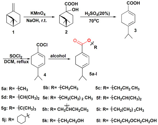 From the lead compound 3, the 12 resulting compounds 5a–5l were obtained by an esterification reaction between dehydrocumic acid chloride and the corresponding alcohols [26].