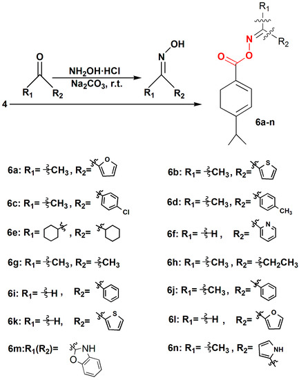 From the lead compound 3, the 14 resulting compounds 6a–6n were obtained by an esterification reaction between dehydrocumic acid chloride and the corresponding oximes [8].