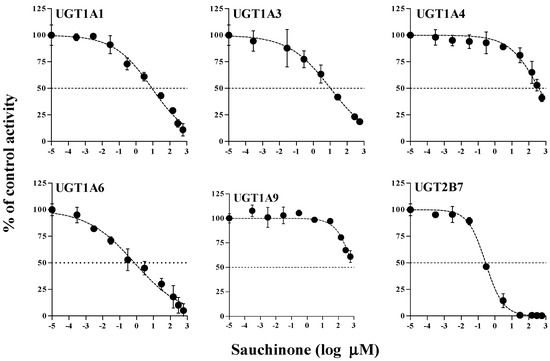 IC50 curves for the direct inhibition of UGT1A1, UGT1A3, UGT1A4, UGT1A6, UGT1A9, and UGT2B7 in HLMs. The ‘●’ represents the remaining percentage of UGT-mediated metabolic activity with sauchinone as an inhibitor versus control (without sauchinone). (n = 3 for each group).