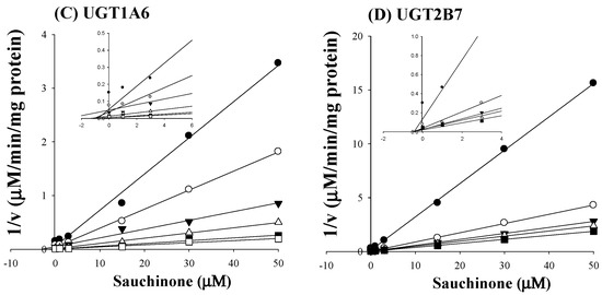 Based on estimated IC50 values of sauchinone, enzyme kinetic assays of sauchinone on inhibition of UGT1A6 and 2B7 activities were conducted. Various concentrations of sauchinone were used and Ki values of sauchinone for UGT1A6 and 2B7 were estimated. Figure 2A,B showed the activities of UGT1A6-mediated serotonin glucuronidation and UGT2B7-mediated zidovudine glucuronidation with and without sauchinone as an inhibitor using nonlinear regression analysis. In Figure 2A, the maximum rate of metabolic activity (Vmax) and Michaelis-Menten constant (Km, the substrate concentration at which the reaction rate is half of Vmax) for UGT1A6-mediated serotonin glucuronidation without sauchinone were 174 μM/min/mg protein and 126 μM, respectively. As increasing sauchinone (as an inhibitor) concentrations from 0 to 50 μM, Vmax tended to decrease from 174 to 6.36 μM/min/mg protein, but Km represented in the ranges of 103–126 μM for UGT1A6-mediated serotonin glucuronidation. Also in Figure 2B, Vmax and Km for UGT2B7-mediated zidovudine glucuronidation without sauchinone were 31.5 μM/min/mg protein and 85 μM, respectively. With increasing sauchinone concentrations (as an inhibitor) from 0 to 50 μM, Vmax tended to decrease from 31.5 to 0.495 μM/min/mg protein, but Km represented in the ranges of 70.2–85.0 μM for UGT2B7-mediated zidovudine glucuronidation.