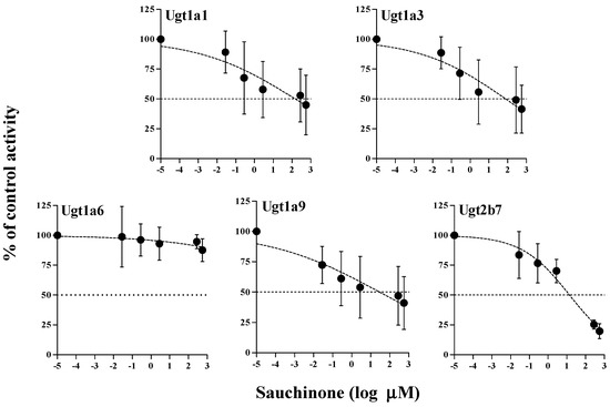 IC50 curves for the direct inhibition of Ugt1a1, Ugt1a3, Ugt1a6, Ugt1a9, and Ugt2b7 in MLM. The ‘●’ represents the remaining percentage of UGT-mediated metabolic activity with sauchinone as an inhibitor versus control (without sauchinone). (n = 3 for each group).