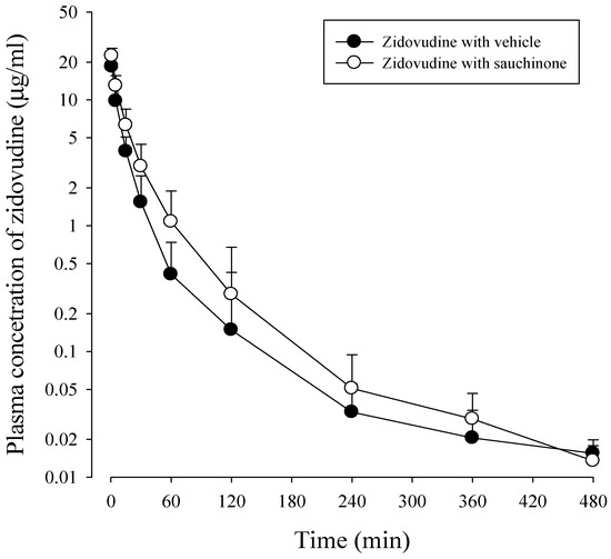 Plasma concentrations of zidovudine after intravenous administration of 15 mg/kg zidovudine with (○: n = 11) and without (●: n = 11) oral administration of 100 mg/kg sauchinone.