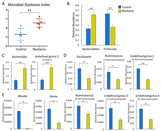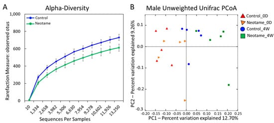2.1. Neotame Consumption Altered Diversities and Component Profiles of the Gut Microbiome in CD-1 Mice