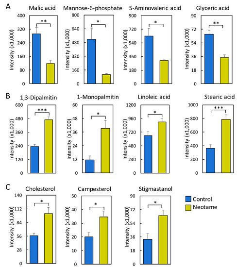 2.3. Neotame Altered Metabolite Profiles in Fecal Samples of Mice