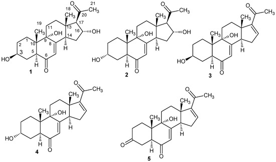 - Mahmoud, F.E.; Kehraus, S.; König, G.M. Caught between triterpene- and steroid-metabolism: 4a-Carboxylic pregnane-derivative from the marine alga-derived fungus Phaeosphaeria spartinae. Steroids 2013, 78, 880–883. [Google Scholar] [CrossRef]