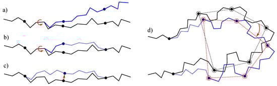 Side-chain moves, which are usually performed separately from backbone moves, are not treated in this section. Side-chain conformations can be sampled by simple perturbations of the bond torsion angles or following more sophisticated approaches [,]. Moreover, different strategies can be adopted to combine backbone and side-chain trial moves in a suitable manner [].