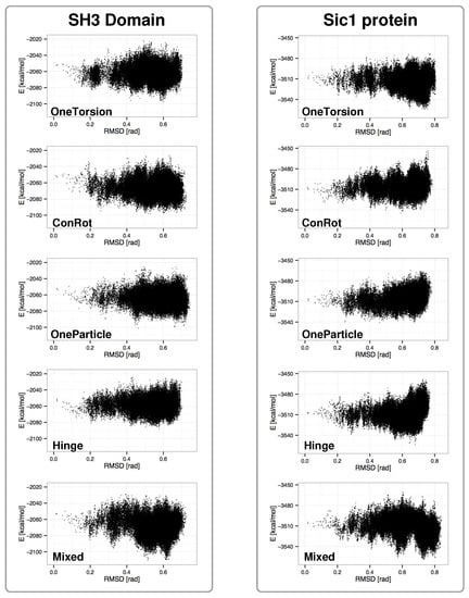 Figure 3 shows plots aimed at comparing the performance of the different move classes in terms of conformational space coverage for the SH3 domain and the Sic1 protein. They represent the projection of the sampled states on two dimensions: the distance with respect to the initial structure and the potential energy. The distance is measured as the root mean square deviation (RMSD) of the bond torsion angles from the initial conformation. For clarity reasons, only one in every one hundred sampled conformations has been plotted (i.e., 20,000 samples from each run). Each plot includes the results of the three runs.
