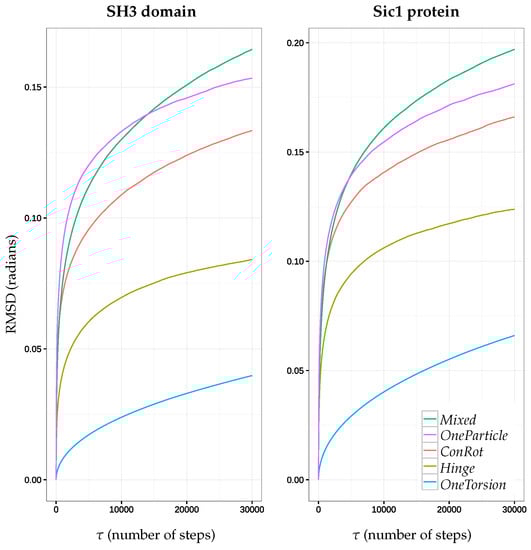 Figure 4 shows the time dependent RMSD function for each move class and for the two molecules, using the results from the aforementioned MC simulations ( accepted samples), for values up to 30,000 MC steps. It provides interesting additional information with respect to the analysis in the previous section, and allows for highlighting more significant differences between the move classes: (1) it confirms that the Mixed move class performs better than the other individual move classes; (2) although the OneParticle and ConRot move classes perform very similarly, it appears that the OneParticle move class explores a bit faster than ConRot. In the case of the SH3 domain, OneParticle can even compete with the Mixed move class on small time scales; and (3) the Hinge move class performs almost two times worse than the Mixed move class for both proteins, while the OneTorsion move class performs almost four times worse. This last result, together with results in the previous section, show that, although OneTorsion moves may provide good performance in terms of coverage (particularly for the disordered Sic1 protein), convergence can be slow.