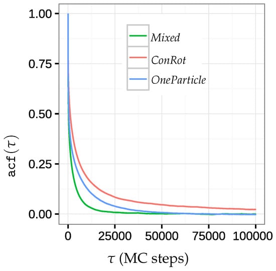 where denotes the expected value of X, denotes the variance of O. and represent two series of observations of O during the MC run with a lag of steps. This formula only holds true when the simulation is stationary. In the context of MC, this requirement implies that the simulation is long enough for the autocorrelation value to converge. Since this would require very long computing time for large systems such as the SH3 domain or the Sic1 protein, we have used a smaller system for this test. Inspired by related work [,], we have used a 14-alanine molecule with a structural constraint: starting from a low energy stable state, corresponding to an -helical conformation, the two end residues were blocked in position and orientation so that the system could only fluctuate around this state. This constraint, associated with the small size of the system, restricts the applicable move classes to ConRot, OneParticle, and a Mixed move class involving both of them.