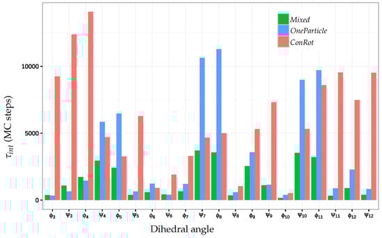 In practice, to reduce computational cost and noisy values, the summation is usually truncated. We have summed for all . The autocorrelation times of the 20 central dihedral angles are plotted in Figure 6, and the statistics for each move class are summarized in Table 3. These results allow us to quantify the improvement of autocorrelation time between the different move classes. The OneParticle move class has an autocorrelation time about 1.8 times lower on average than the ConRot move class, while the Mixed move class consistently outperforms the OneParticle move class by a factor of 2. These results confirm that the Mixed move class is much more efficient than the individual move classes.