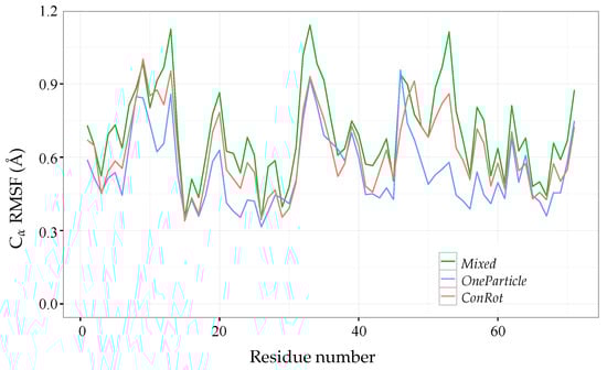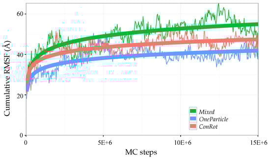 The efficiency of the different move classes can be roughly evaluated and compared by looking at the evolution of the RMSF with the number of iterations. The RMSF of a particular atom is expected to grow with the simulation time, and eventually converge to a maximum value when the energy basing around the equilibrium state has been completely explored. Figure 9 shows the evolution of the cumulative RMSF (i.e., the sum of the RMSF values of all C atoms) with the length of the simulation. The plot confirms a faster exploration of the Mixed move class, which allows reaching a cumulative RMSF value around 50 Å after MC steps, whereas the individual ConRot and OneParticle move classes only attain 40 Å. These values are also very similar to the ones obtained by Bottaro et al. []. In fact, a direct comparison of Figure 9 in this paper and Figure 4 in the referred publication suggests a faster convergence of our Mixed move class with respect to the CRISP move class, which requires around 10 times more iterations to reach 50 Å ( MC steps instead of MC steps). However, such a direct comparison should be put into perspective because the models and the implementations are different.