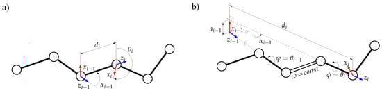 The elements of depend on the bond geometry. Assuming constant bond lengths and bond angles, the parameters and (which can be directly computed from them) are constant. The bond torsion angle is the only variable parameter. Figure 10 illustrates the method to assign the frames and to obtain the mDH parameters in a general case, and when peptide bond torsion angles () are considered to have an arbitrary constant value. Note that, in the general case, when all the bond torsion angles are variable, the parameters .